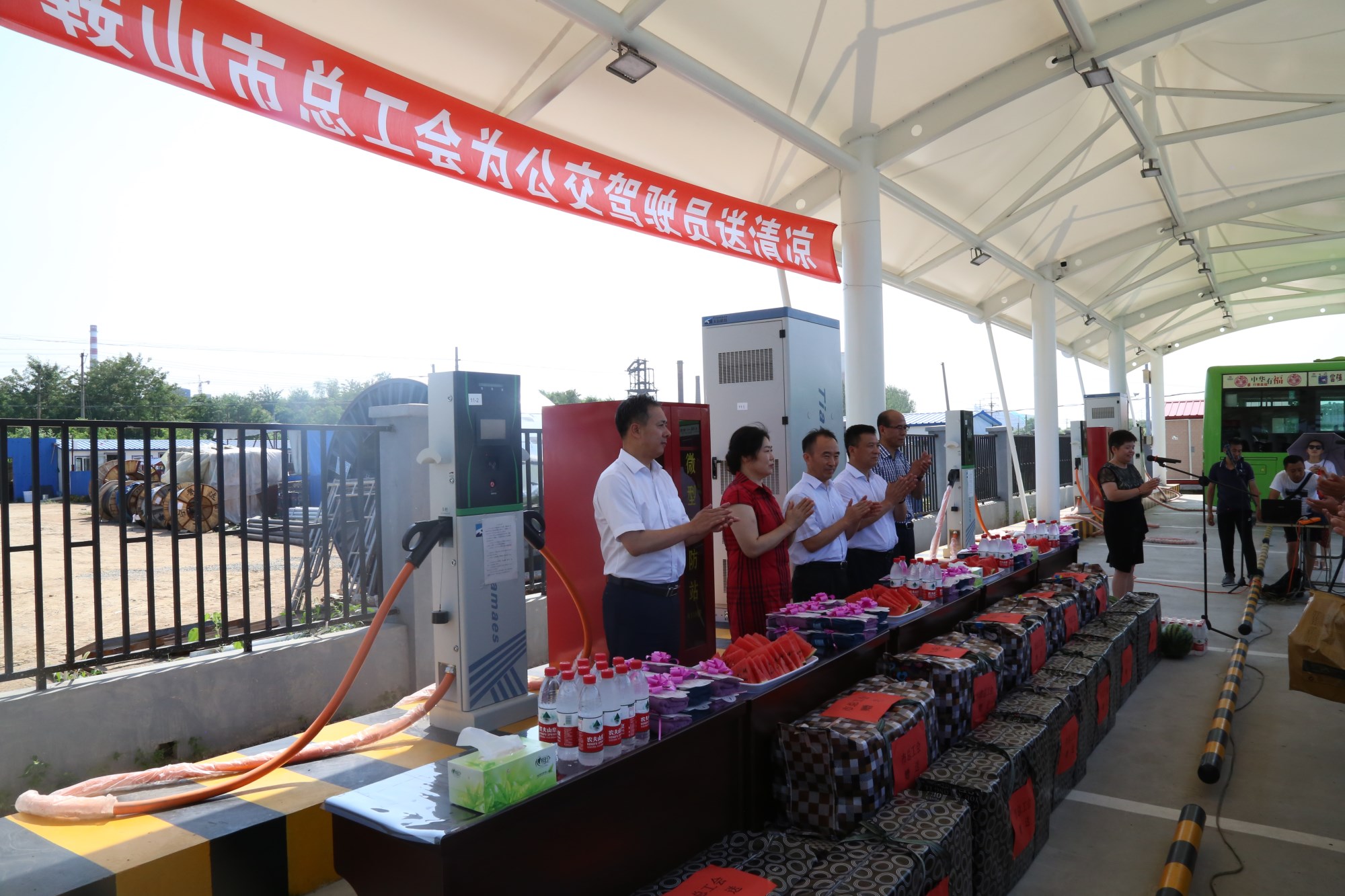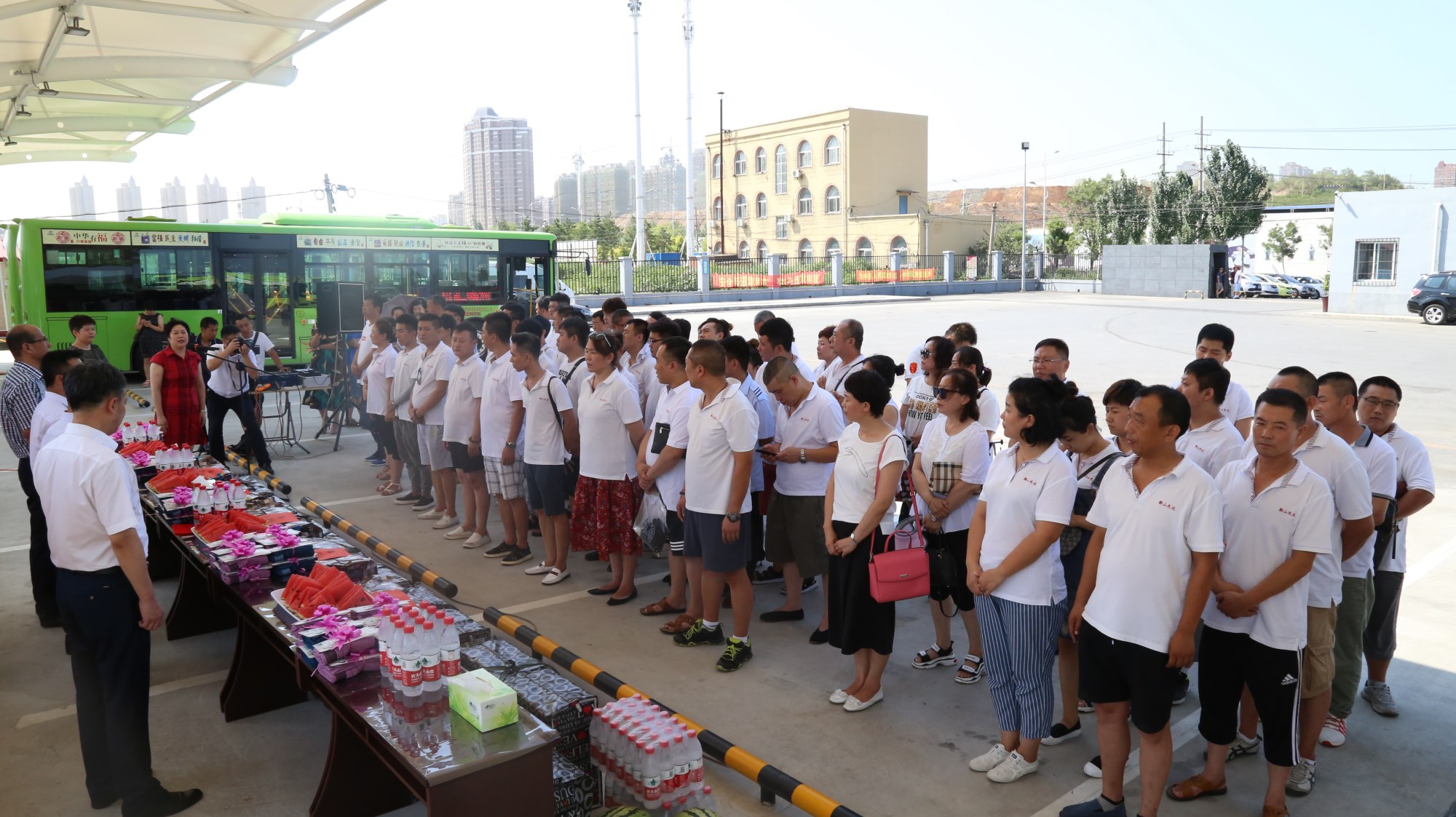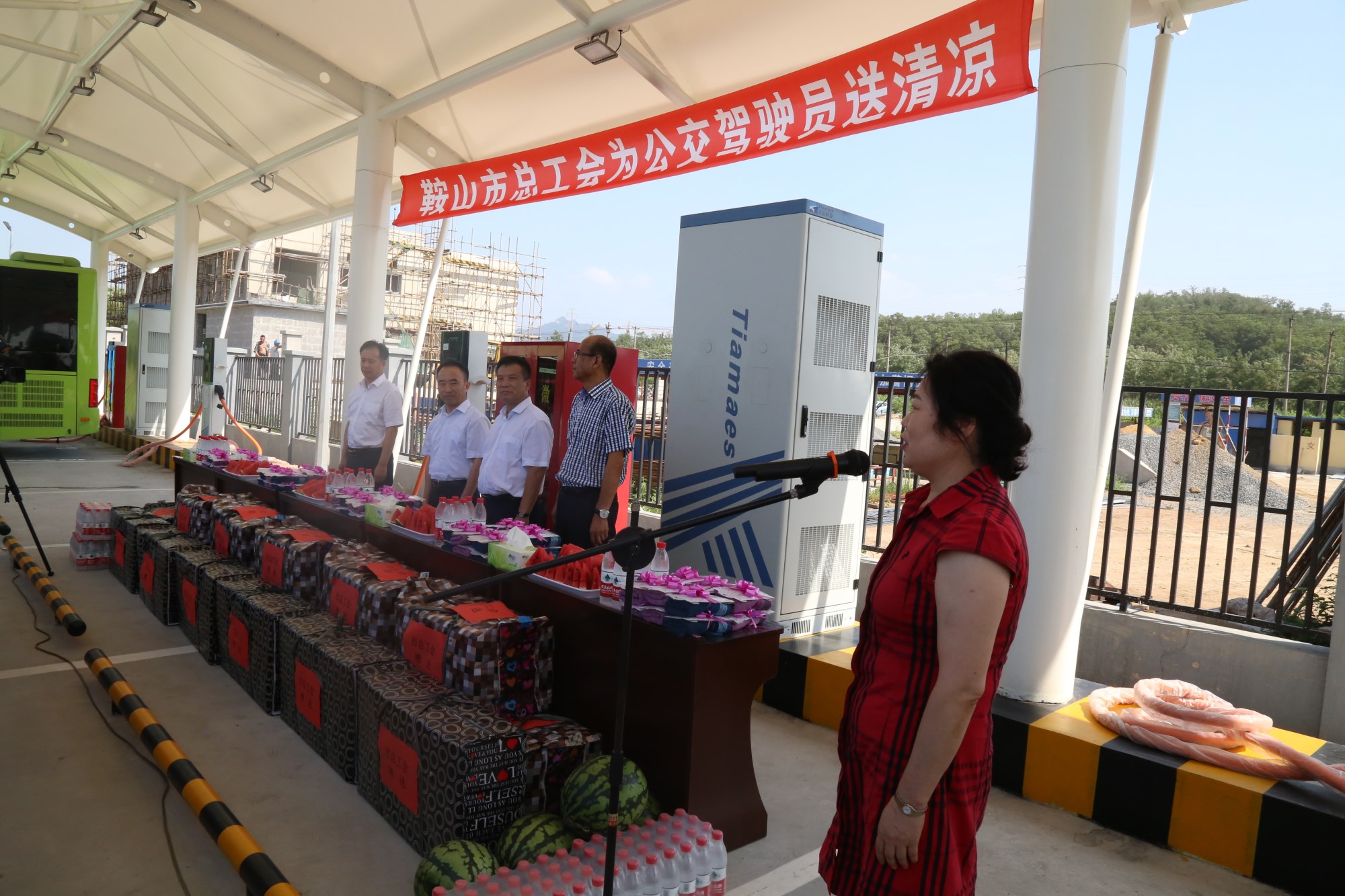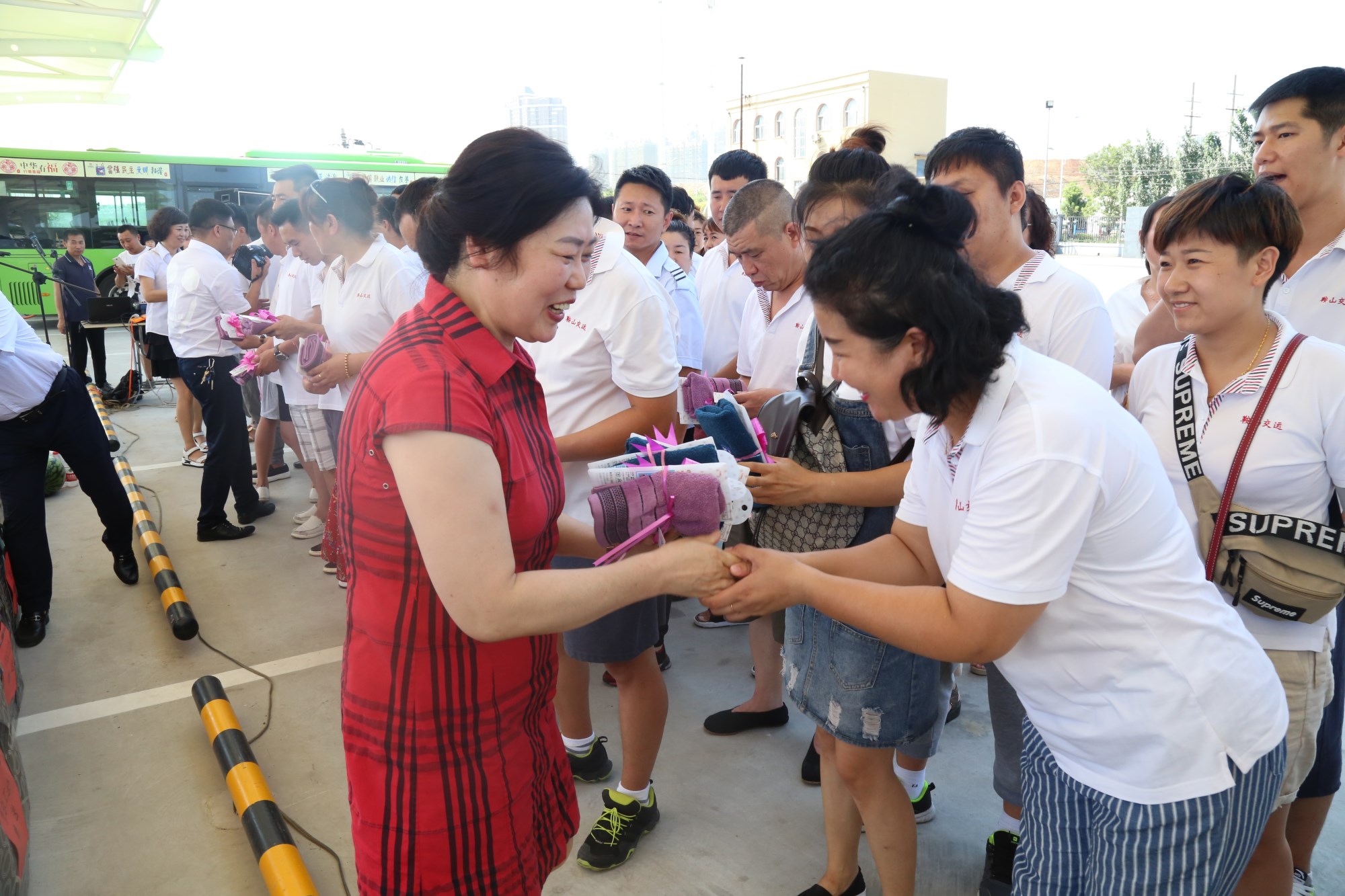 2018年8月1日下午,鞍山市總工會在交運(yùn)集團(tuán)第二汽車分公司216路終點(diǎn)站舉行了為公交一線駕駛員送清涼活動。鞍山市人大常委會副主任、市總工會主席解永孚;市總工會副主席李展程;市國資委黨委書記、主任顧洪新等領(lǐng)導(dǎo)來到216路調(diào)度室看望了交運(yùn)集團(tuán)一線駕駛員,為他們送去夏日里的清涼與工會組織的慰問。交運(yùn)集團(tuán)黨委書記、董事長羅玉艷;總經(jīng)理王春江;黨委副書記、紀(jì)委書記、工會主席金秀石出席了活動;顒又校贿\(yùn)集團(tuán)黨委書記、董事長羅玉艷向市總工會領(lǐng)導(dǎo)介紹了企業(yè)生產(chǎn)運(yùn)營情況,并代表集團(tuán)職工向市總工會表示感謝。隨后,市總工會主席解永孚代表市總工會對高溫酷暑中仍堅(jiān)守崗位、辛勤工作的交運(yùn)一線職工致以親切的問候,希望交運(yùn)集團(tuán)廣大職工繼續(xù)發(fā)揚(yáng)艱苦奮斗、愛崗敬業(yè)精神,注意防暑和行車安全,以更好的狀態(tài)投入到工作中服務(wù)好市民乘客,并將市總工會撥付的2萬元慰問金交到交運(yùn)集團(tuán)董事長手中。第二汽車分公司2路線駕駛員謝金紅在活動中代表一線駕駛員作了表態(tài)發(fā)言。最后,各級領(lǐng)導(dǎo)在現(xiàn)場親手將交運(yùn)集團(tuán)工會為一線職工準(zhǔn)備了冰袖、毛巾、西瓜、冰鎮(zhèn)礦泉水等慰問物資發(fā)到職工手中。