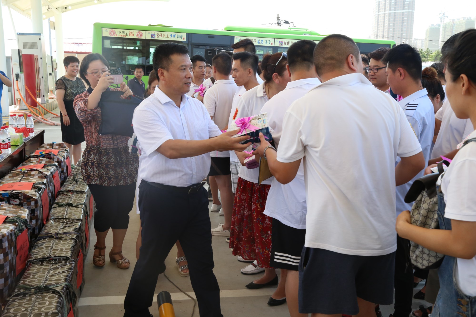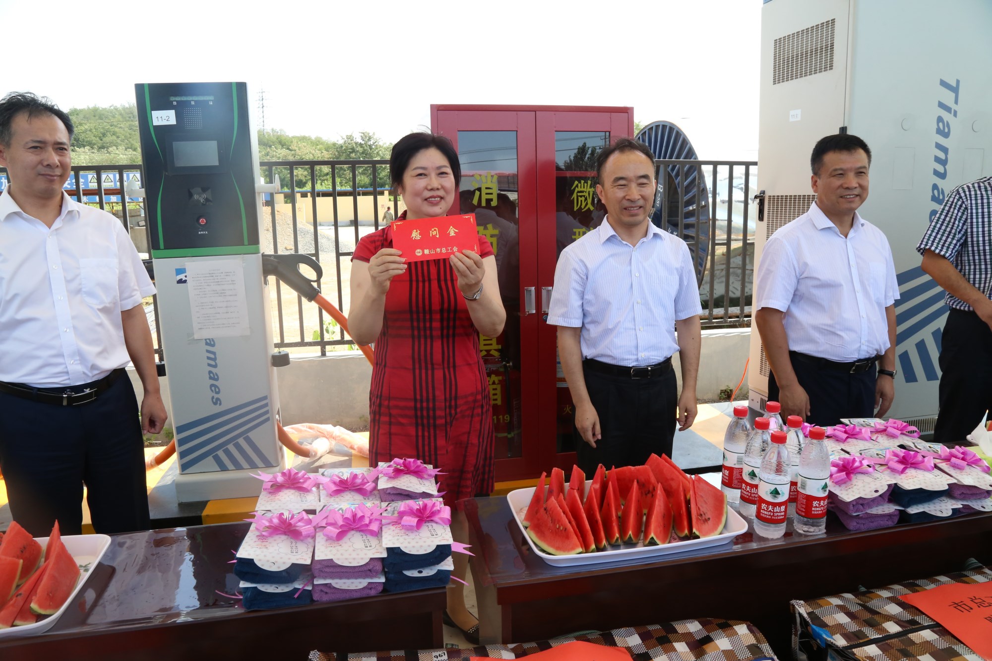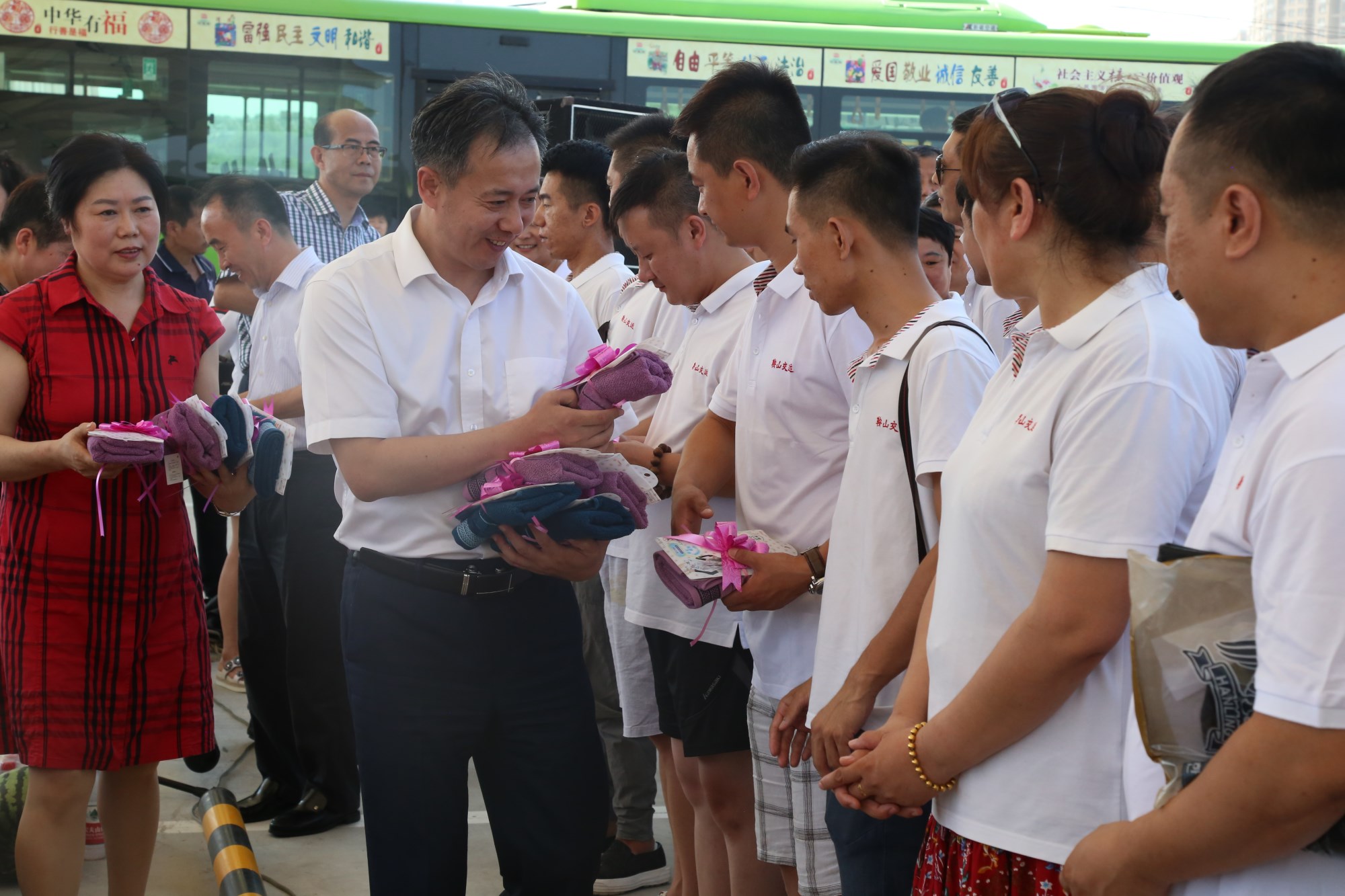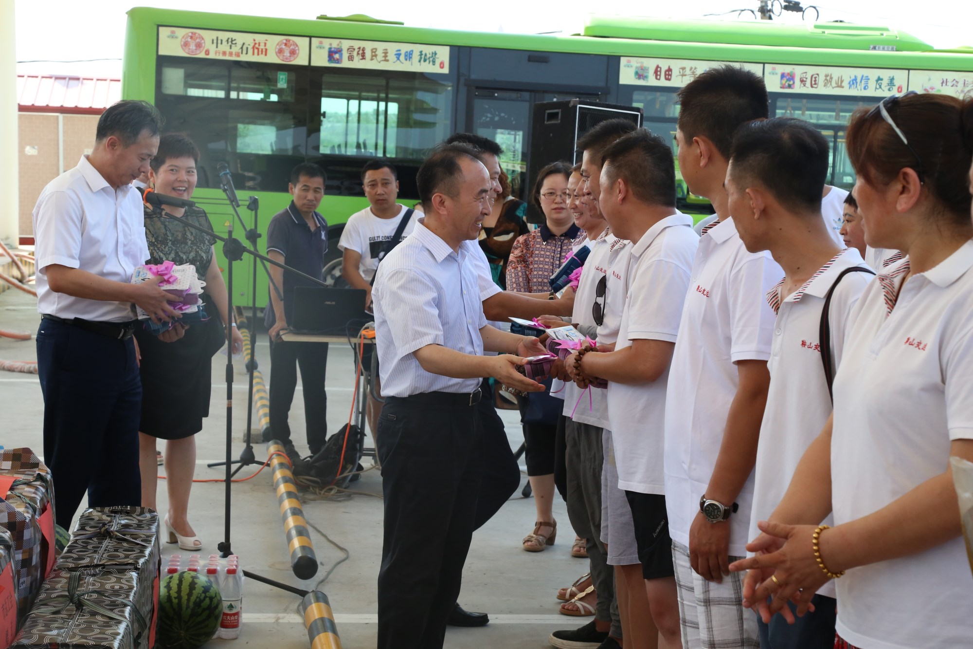 2018年8月1日下午,鞍山市總工會在交運(yùn)集團(tuán)第二汽車分公司216路終點(diǎn)站舉行了為公交一線駕駛員送清涼活動。鞍山市人大常委會副主任、市總工會主席解永孚;市總工會副主席李展程;市國資委黨委書記、主任顧洪新等領(lǐng)導(dǎo)來到216路調(diào)度室看望了交運(yùn)集團(tuán)一線駕駛員,為他們送去夏日里的清涼與工會組織的慰問。交運(yùn)集團(tuán)黨委書記、董事長羅玉艷;總經(jīng)理王春江;黨委副書記、紀(jì)委書記、工會主席金秀石出席了活動;顒又校贿\(yùn)集團(tuán)黨委書記、董事長羅玉艷向市總工會領(lǐng)導(dǎo)介紹了企業(yè)生產(chǎn)運(yùn)營情況,并代表集團(tuán)職工向市總工會表示感謝。隨后,市總工會主席解永孚代表市總工會對高溫酷暑中仍堅(jiān)守崗位、辛勤工作的交運(yùn)一線職工致以親切的問候,希望交運(yùn)集團(tuán)廣大職工繼續(xù)發(fā)揚(yáng)艱苦奮斗、愛崗敬業(yè)精神,注意防暑和行車安全,以更好的狀態(tài)投入到工作中服務(wù)好市民乘客,并將市總工會撥付的2萬元慰問金交到交運(yùn)集團(tuán)董事長手中。第二汽車分公司2路線駕駛員謝金紅在活動中代表一線駕駛員作了表態(tài)發(fā)言。最后,各級領(lǐng)導(dǎo)在現(xiàn)場親手將交運(yùn)集團(tuán)工會為一線職工準(zhǔn)備了冰袖、毛巾、西瓜、冰鎮(zhèn)礦泉水等慰問物資發(fā)到職工手中。